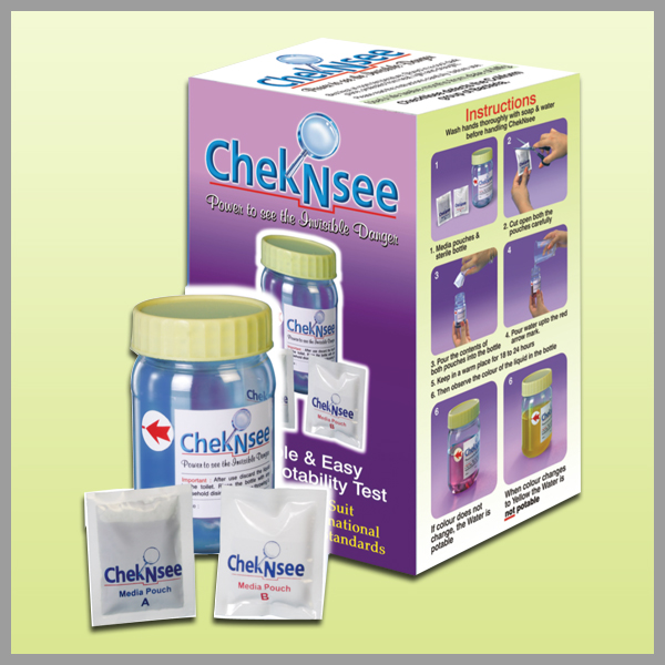 ChekNsee® tests a group of bacteria, which are found in sewage. They are present in the intestine of man and animal and are generally accompanied by the harmful disease causing bacteria. ChekNsee helps to check water from all kinds of sources viz. taps, purifiers, coolers, storage tanks, rivers, ponds, springs etc.. This extremely simple and convenient test can be carried out by anybody, anywhere i.e. homes, offices, factories, shops, banks, hospitals, hotels, schools, etc.